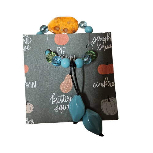 Two dangling, sculpted turquoise beads finish the look with playful movement, suspended by durable black cord. This bracelet comes mounted on a charming fall-themed display card—perfect for gifting or seasonal display.