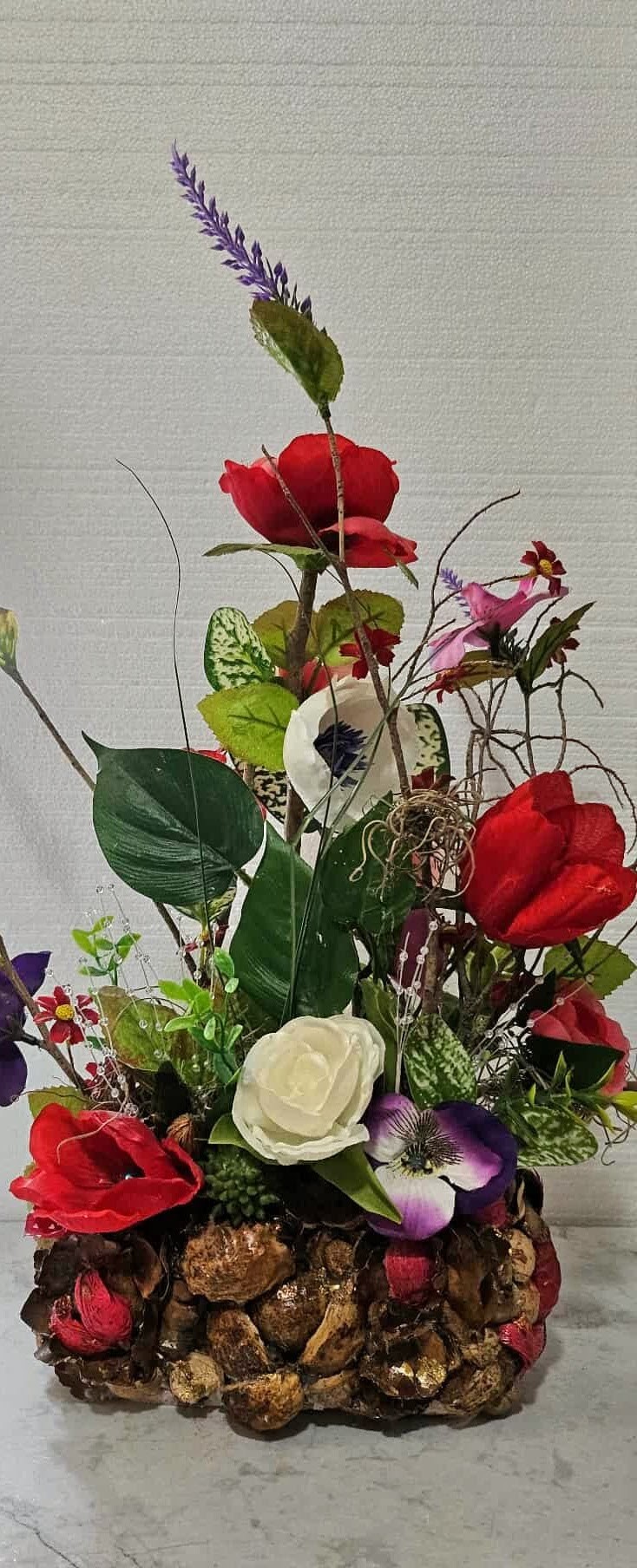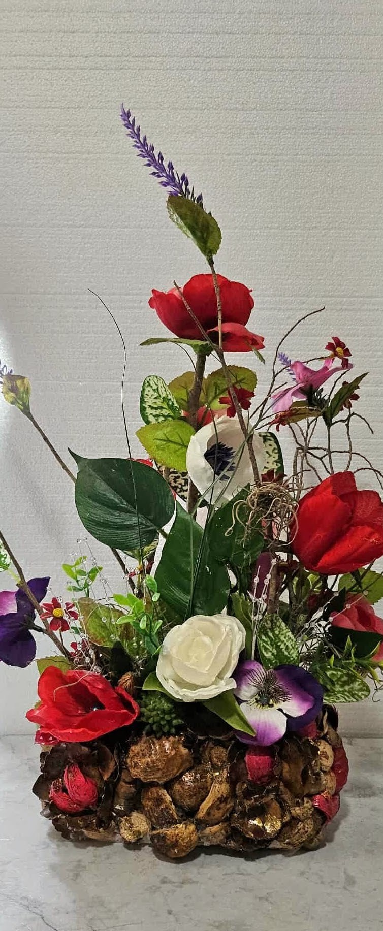 Floral arrangement with artesian base; Hermoso arreglo floral artesanal con rosas rojas, flor blanca central y acentos en tonos morados. Elaborado en una base rústica hecha con piezas de pino y elementos naturales. Perfecto para decorar salas, recibidores u oficinas. Aporta un toque elegante, tradicional y lleno de color a cualquier espacio.