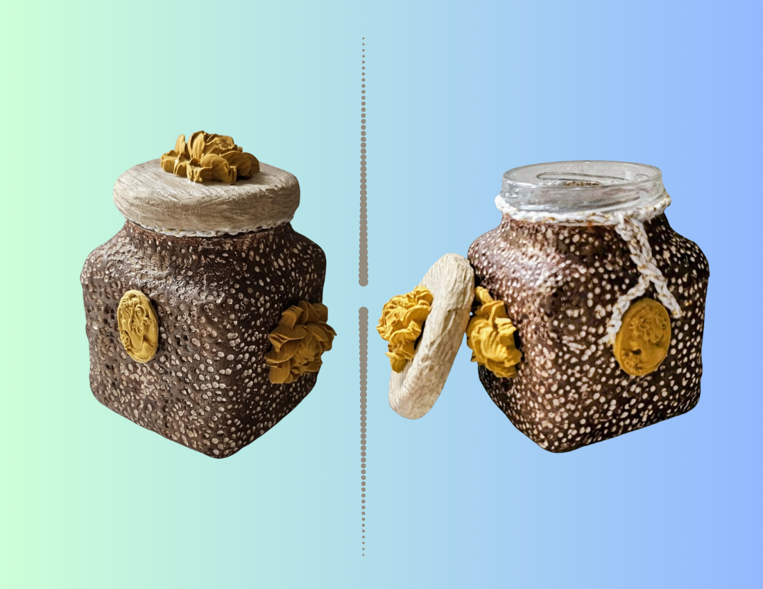 Pieza única hecha a mano. Este frasco decorativo presenta un acabado texturizado en tonos marrón y crema, con detalles artesanales en la tapa y un medallón decorativo en dorado. Incluye floraciones decorativas en tono mostaza que le añaden un toque elegante y distintivo. Ideal para usar como adorno en salas, baños, repisas o como frasco temático para regalos.