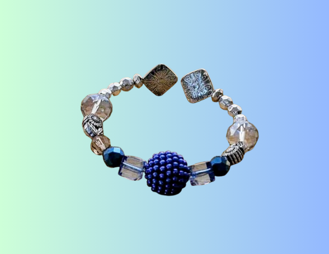 Pulsera elástica hecha a mano con cuentas transparentes tipo cristal, detalles metálicos en plateado y un llamativo centro azul texturizado. Combina elegancia y estilo moderno, ideal para uso diario o como accesorio distintivo en ocasiones especiales. Ligera, cómoda y única. Perfecta para regalar o complementar cualquier outfit.
