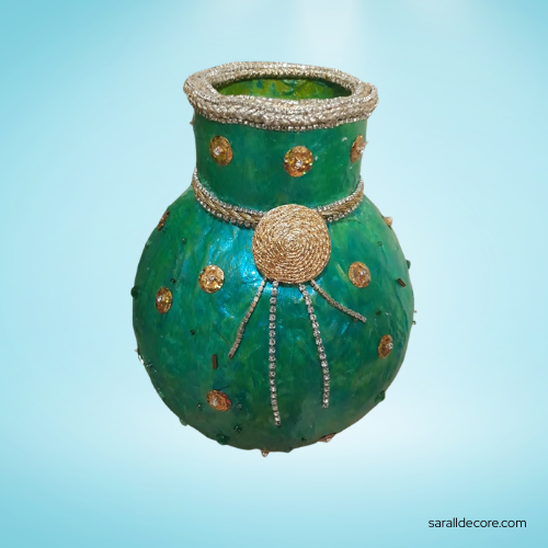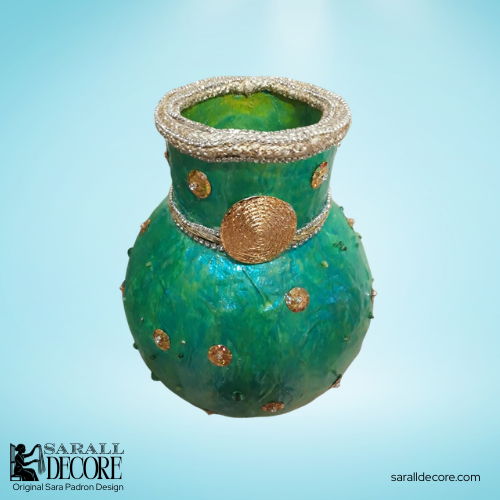 Este jarrón decorativo, de estilo barroco antiguo, es una pieza única creada por Sara Padrón. Su diseño cuenta la historia de un grupo de esclavos que, durante la conquista, quedaron fascinados con la elegancia de la cerámica europea. En su intento por capturar aquella belleza que no comprendían pero los cautivaba, plasmaron en esta obra su interpretación del mundo espiritual: